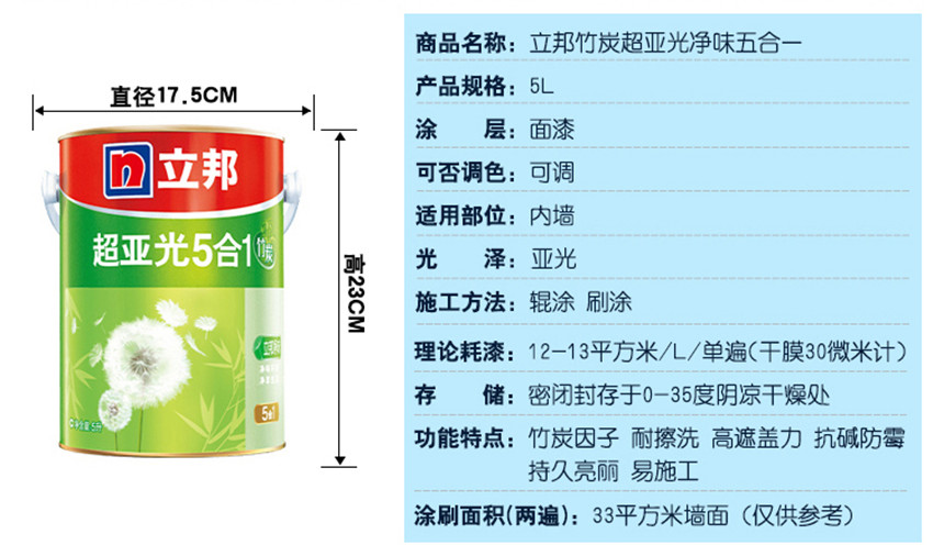立邦漆乳膠漆 內(nèi)墻竹炭超亞光凈味五合一環(huán)保油漆涂料白色墻面漆 (可調(diào)色)?